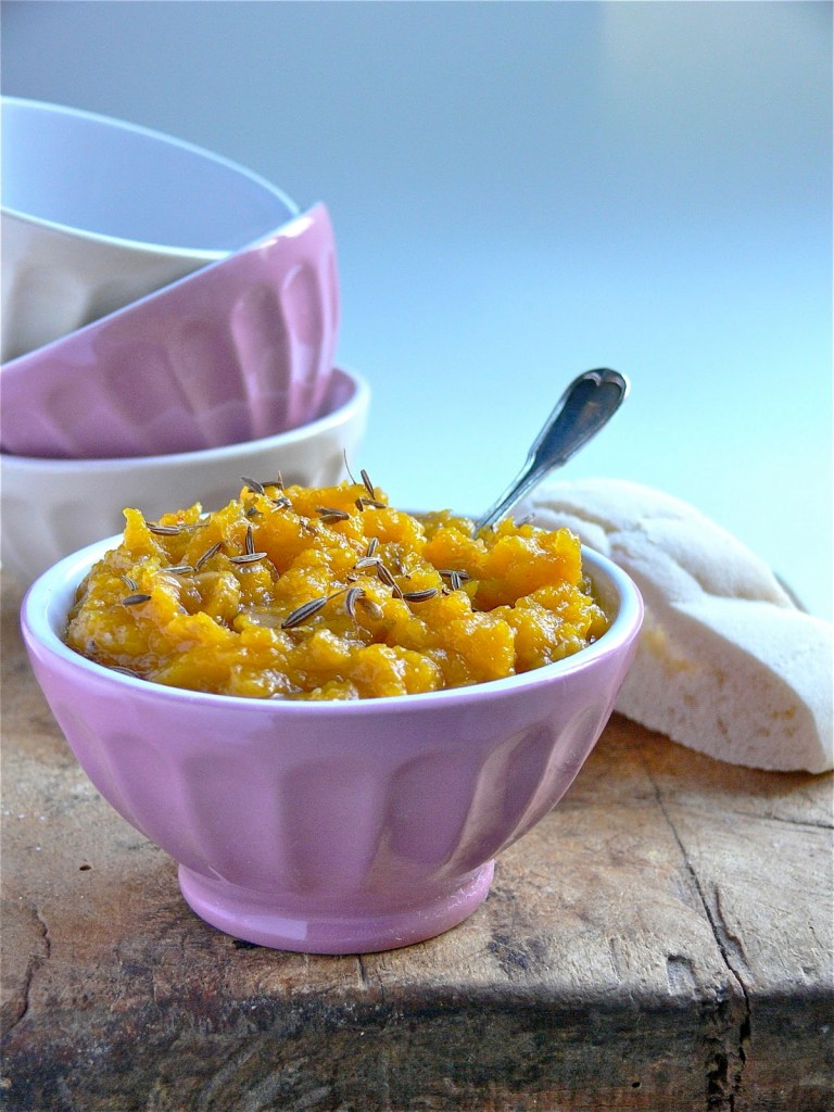 Cuocere in una padella con coperchio la zucca tagliata a dadini con 4 cucchiai di olio. Lasciare cuocere lentamente finché non risulti morbida da poter essere schiacciata con una forchetta. Aggiungere la paprika, l’aglio schiacciato e far soffriggere il tutto ancora per 10 min. Aggiustare di sale e pepe unire l’aceto di mele e far evaporare per 2/4 min. Prima di toglierla dal fuoco unire i semi di cumino schiacciati nel mortaio, mescolare bene e lasciare raffreddare per 15 minuti. Servire a temperatura ambiente, da gustare su fette di pane tostato e pita calda.