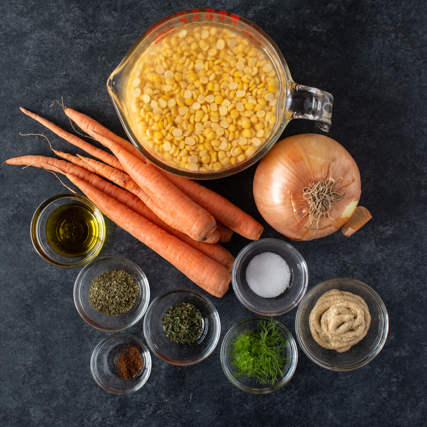 400 g piselli spezzati, 2 cipolle affettate finissime, 200 g di carote, 6 tazze di acqua circa, 1 pezzo di maiale non troppo grasso, circa 500 g, 1 cipolla bianca steccata con chiodi di garofano, timo, sale, maggiorana, noce di burro