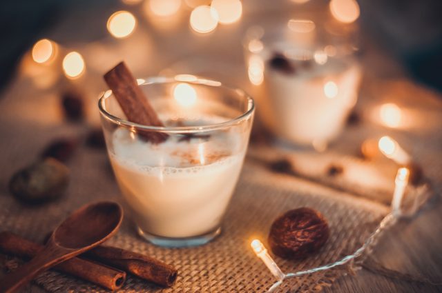EGGNOG una bevanda tradizionale inglese molto simile allo zabaione, si può trovare anche in Francia con il nome di Lait de poule. Nasce a Londra nel 1700 ed è molto diffusa in tutti i paesi anglofoni, dagli Usa alla Nuova Zelanda, dal Canada a Malta ed è presente nelle tavole, gustata anche come drink, nel periodo dell’Avvento e di Natale. Per la preparazione occorrono 500 ml latte,250 ml panna fresca liquida, 150 ml Brandy, 150 ml rum, 150 g zucchero, 5 uova, cannella in polvere. Dividere i tuorli dagli albumi emontarli a neve ben ferma. Mettete in una ciotola i tuorli delle uova insieme allo zucchero e sbatteteli fino ad ottenere un compostospumoso.Continuando a sbattere aggiungere ilrum, il brandy, la panna e il latte e sbattete ancora 5 minuti. Unire anche gli albumi montati a neve e amalgamarli completamente al resto degli ingredienti mescolando dal basso verso l’alto. Mettere l’Eggnog nei bicchieri e spolverare con cannella in polvere o con un pizzico di noce moscata. Va servito caldo, da solo, trattandosi quasi di un dessert, magari accompagnato da piccola pasticceria secca, come i famosi shortbread,biscottini burrosi inglesi, decorato con stecche di cannella e anice stellato.