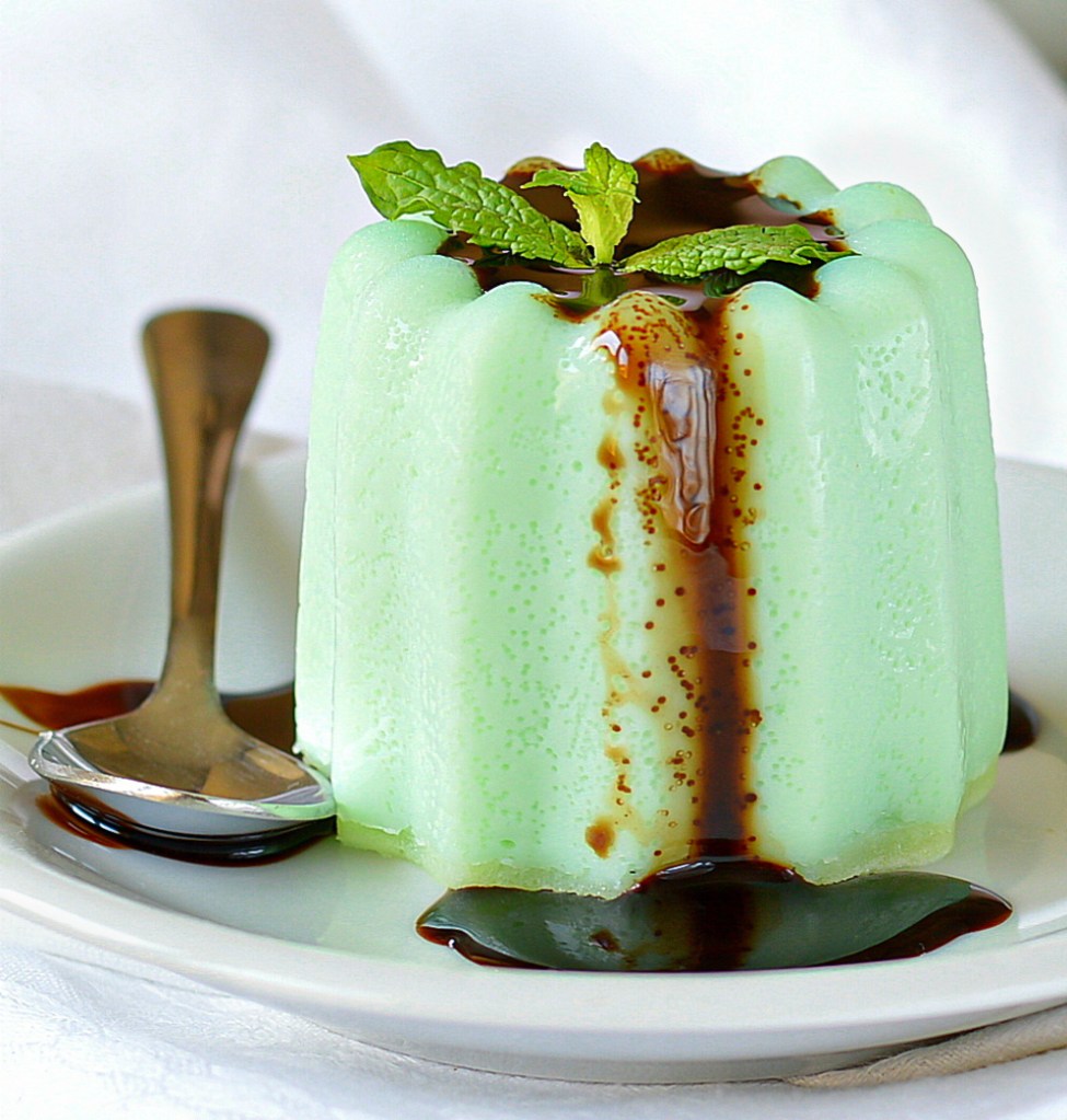 Latte e menta, un sapore che mi fa fare un balzo nel passato, nei caldi pomeriggi al mare era unabevanda che non mancava mai nelle merende di noi bambini. Analcolica, tradizionale, fresca e nutriente, un abbinamento di ingredienti che si ritrovano in una ricetta altrettanto rinfrescante, semplice e rapida nella preparazione, la Panna cotta alla menta con salsa di cioccolato: dessert al cucchiaio, dove si incontrano ancora una volta, con grande successo, due dolcezze: menta e cioccolato si accompagnano perfettamente in questo dolce al cucchiaio e la fantasia corre tra i giochi di colore. conclusione perfetta per le cene estive, può essere realizzata con lo sciroppo alla menta o si può utilizzare anche della menta fresca frullata con poco zucchero.